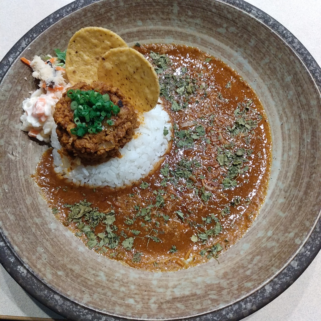 スパイスなのかハーブなのか、なにかの葉っぱがふんだんに散りばめられているこのカレーに面食らいます。